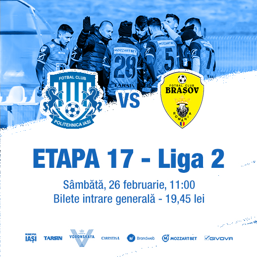 Sâmbătă, 26 februarie, la ora 11.00, va avea loc întâlnirea dintre CSM Politehnica Iași și FC Brașov, partidă contând pentru etapa a XVII-a a campionatuluui Ligii 2 Casa Pariurilor.