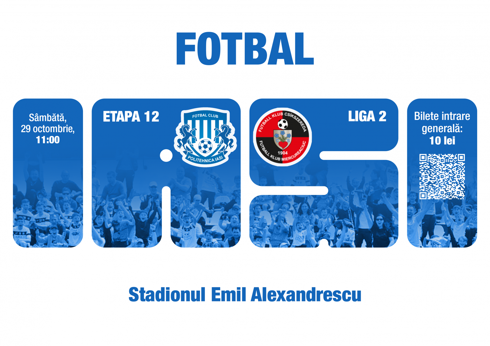 Sâmbătă, 25 octombrie, de la ora 11.00, Stadionul Emil Alexandrescu din Copou va găzdui partida dintre Poli Iași și FK Csikszereda, din etapa a zecea a campionatului Ligii 2. Biletele pot fi achiziționate online